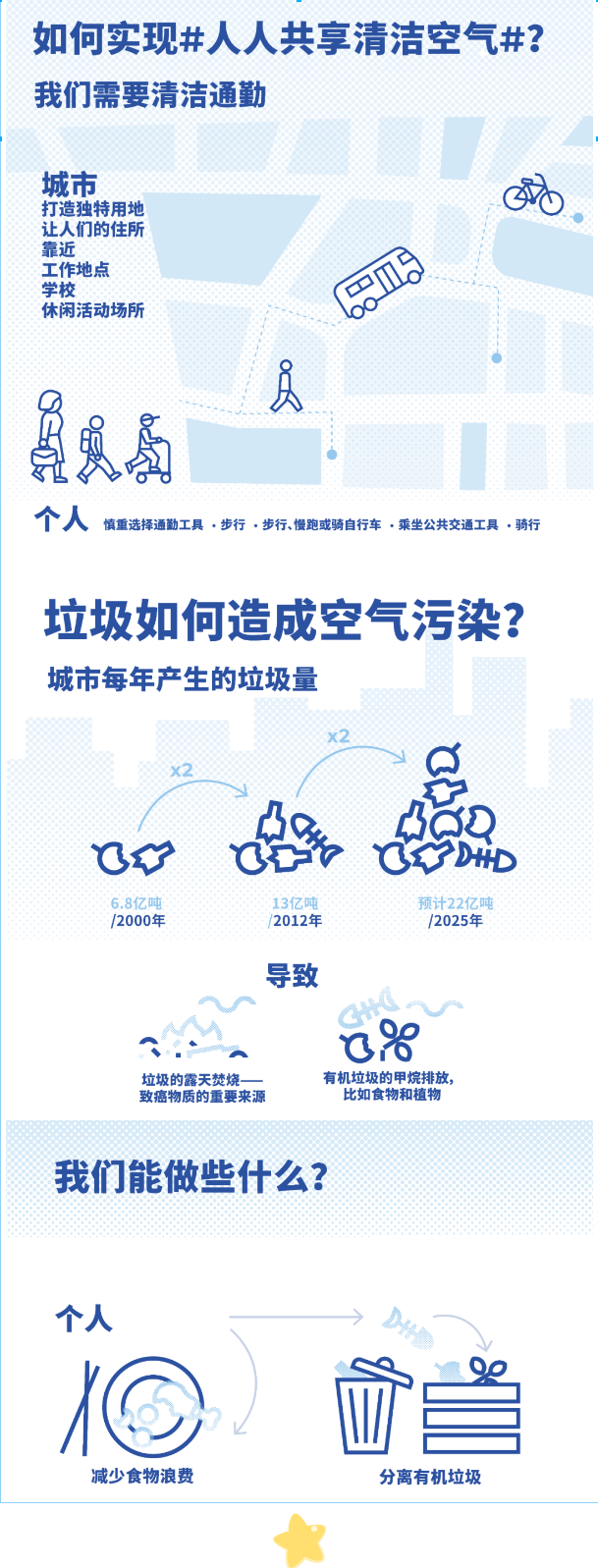 空氣污染對氣候會產(chǎn)生什么影響?如何實現(xiàn)#人人共享清潔空氣#?垃圾如何造成空氣污染?我們能做些什么?......預(yù)防空氣污染我們也可以做些小事情綠色出行、減少污染物排放簡約生活、減少資源能源浪費(fèi)湛藍(lán)的天空,需要你我的努力
